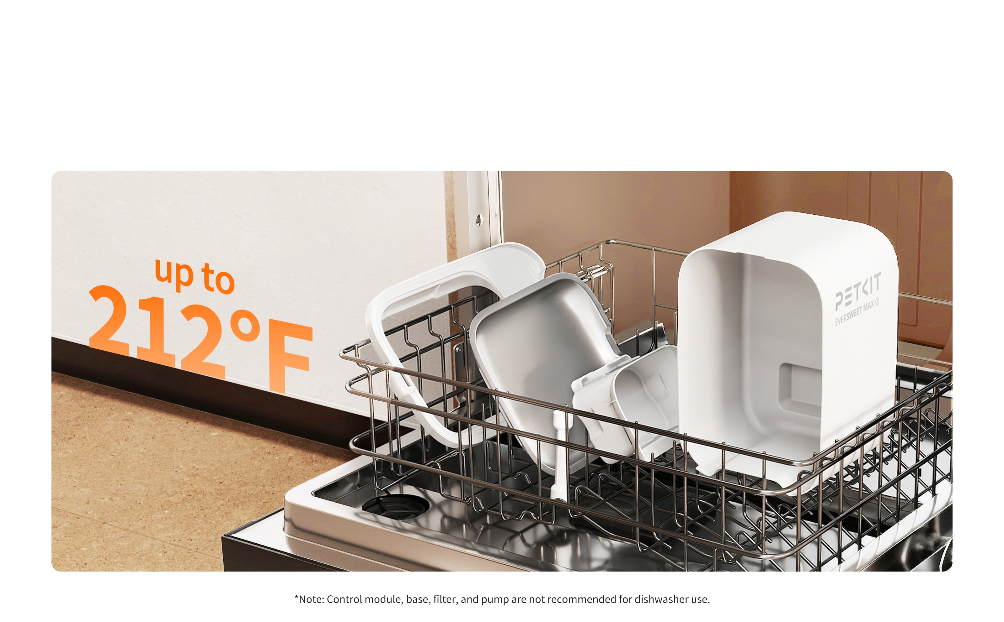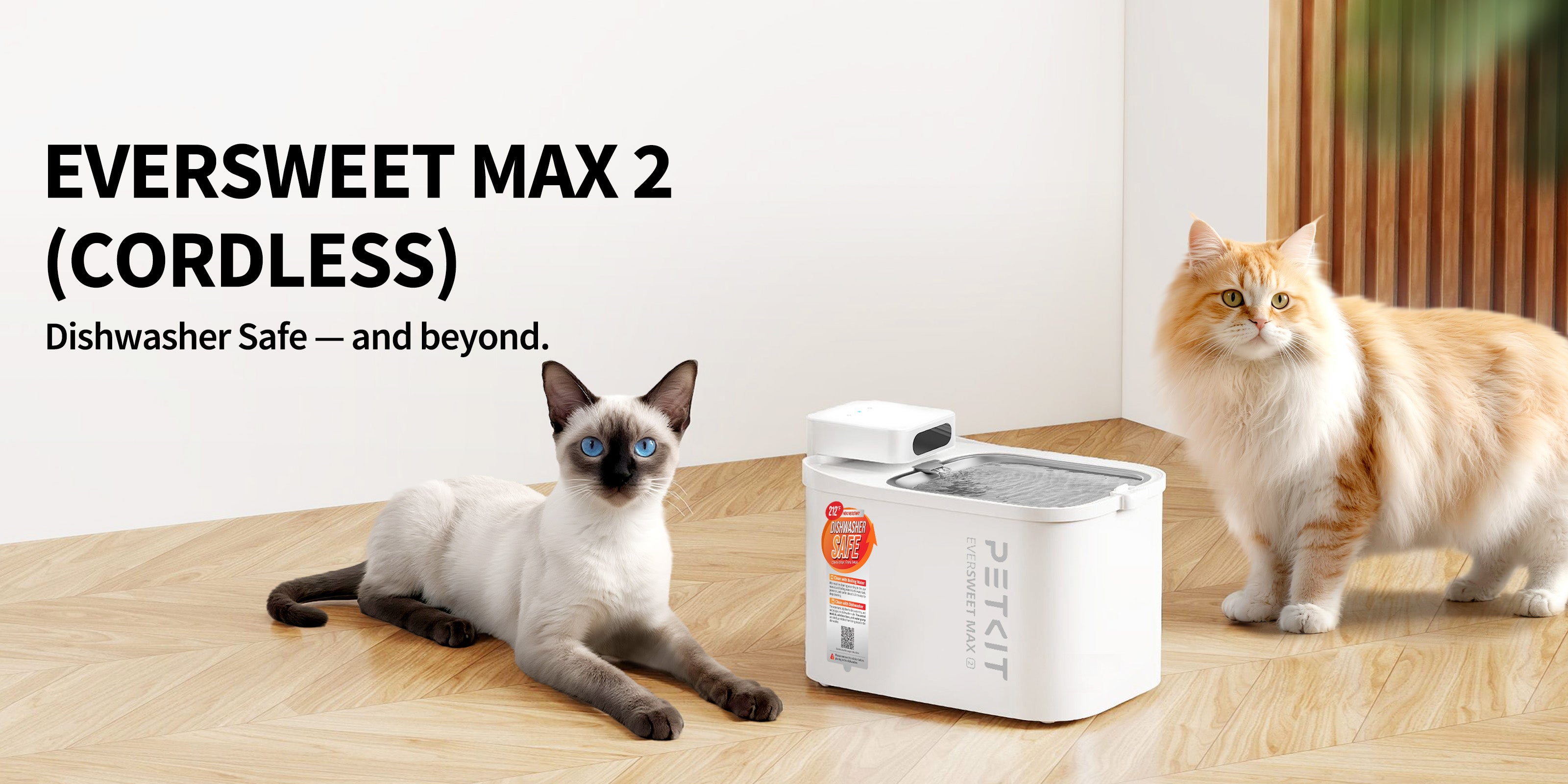 EVERSWEET MAX 2 (CORDLESS) PET WATER FOUNTAIN features heat-resistant, dishwasher-safe PPO materials for safe and easy cleaning. A 304 stainless steel tray resists biofilm, while the 5° tilt design removes floating hair to keep water fresh. With three drinking modes, Bluetooth App monitoring, and up to 83 days of cordless battery life, it offers hygienic, quiet, and reliable hydration for cats and small dogs.