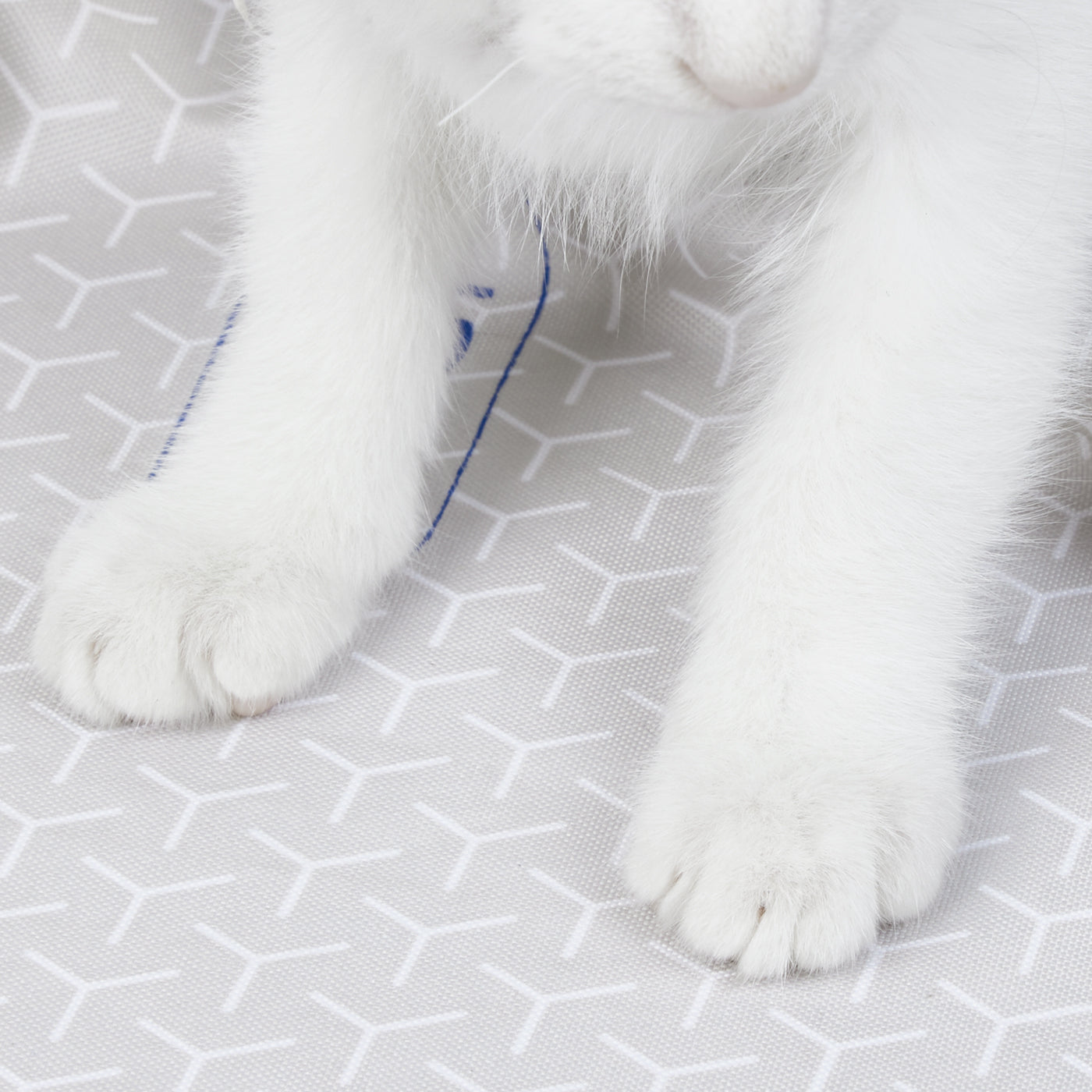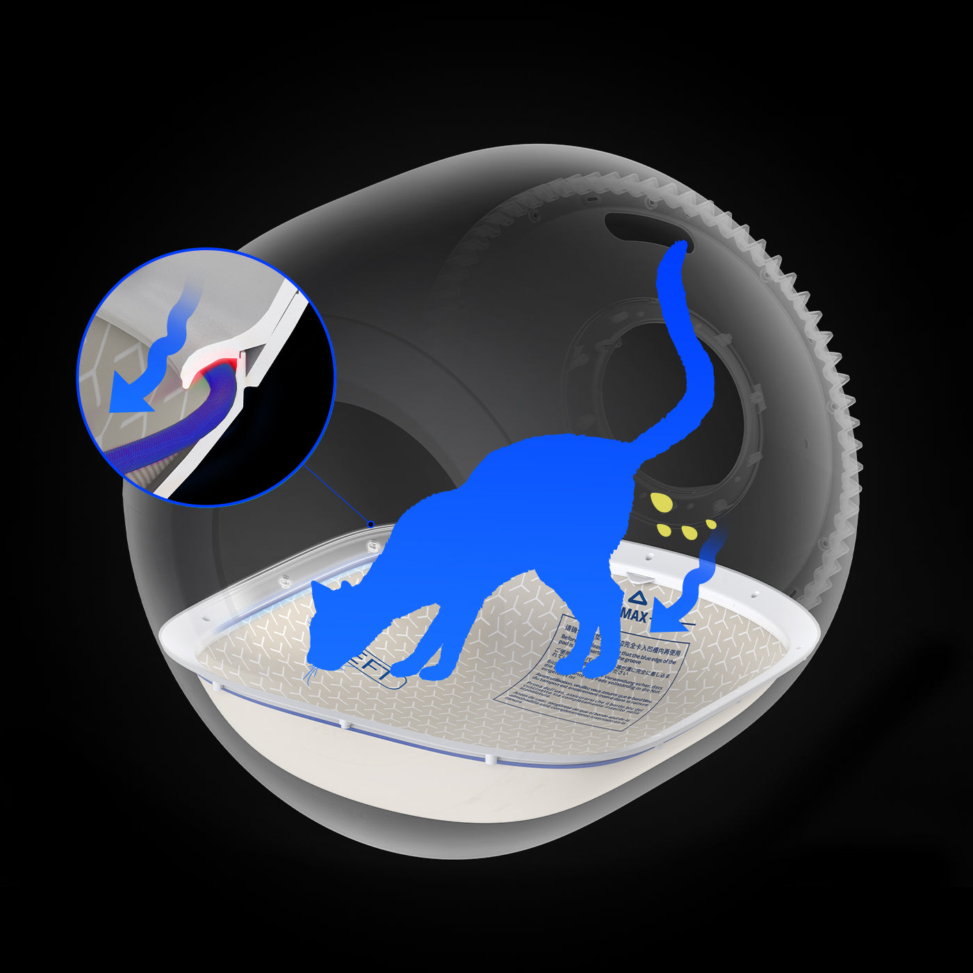 The blue elastic edge is fully inserted into the groove, remaining firm to guide urine flow along the brim structure to the pad. Avoid any leakage resulting from your cat urinating along the edge.