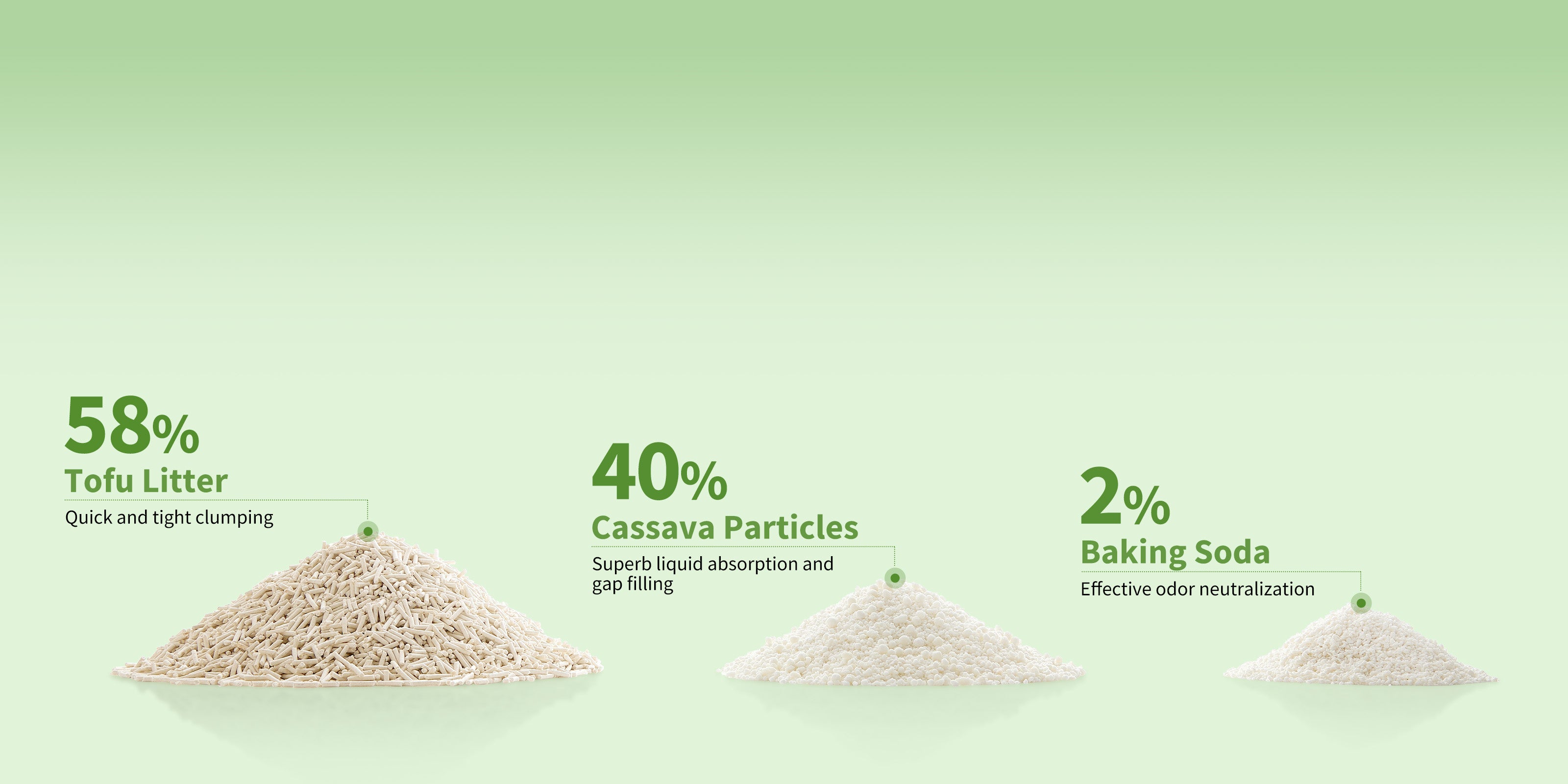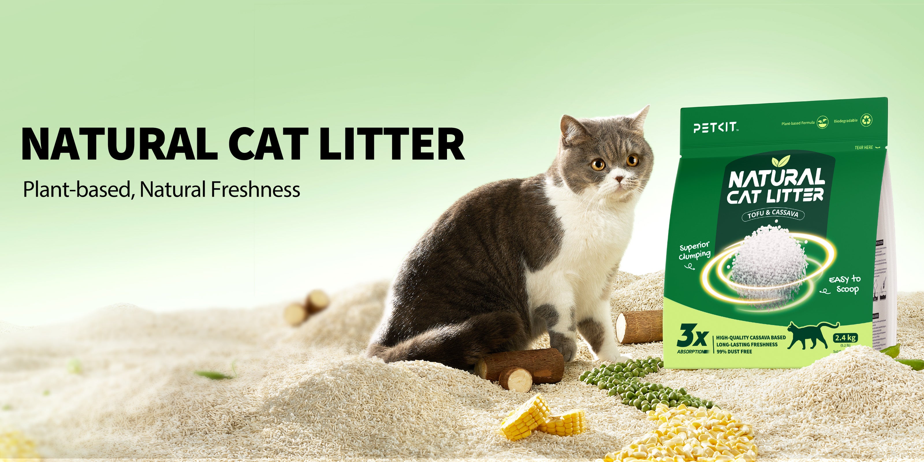 Biodegradable and eco-friendly to the earth. This cat litter is made from all-natural ingredients—corn, pea, cassava, and baking soda—ensuring 100% safe use even if your cat accidentally eats it.