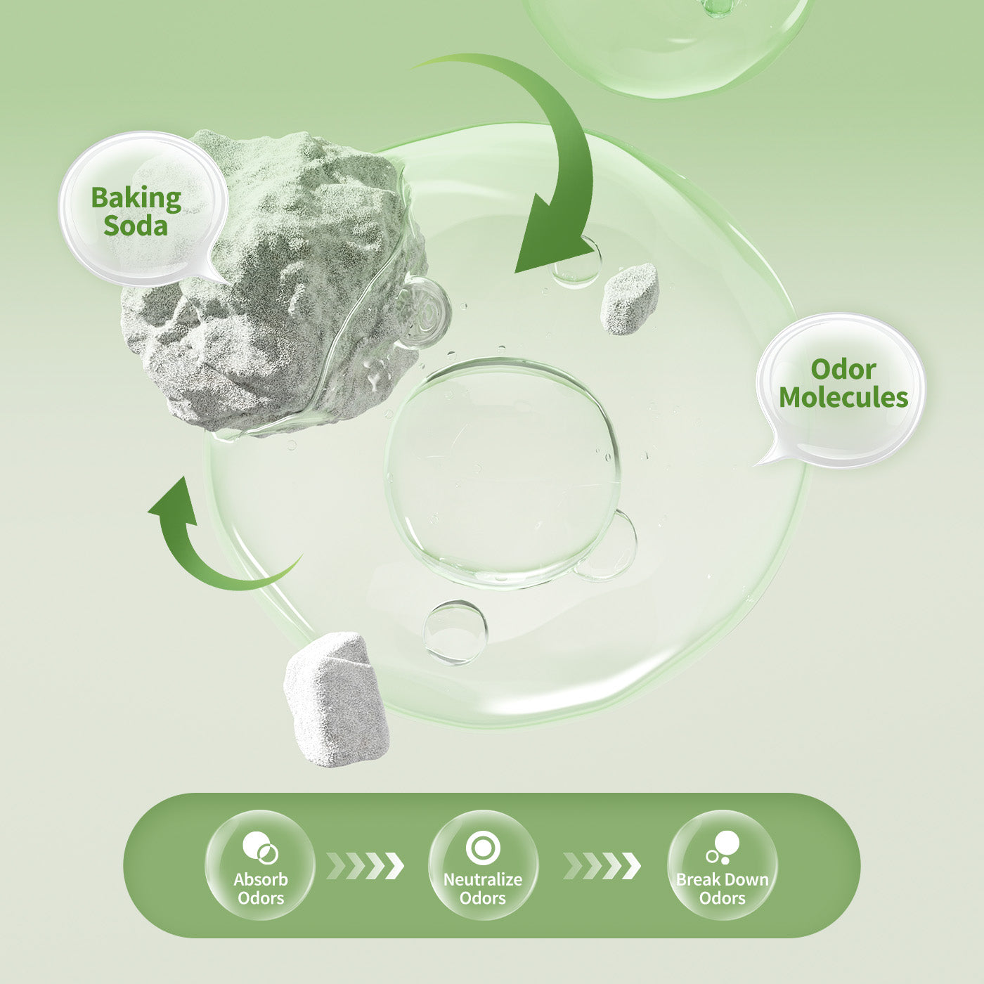 Decompose odors in 3 steps. Baking soda (NaHCO3) neutralizes odor molecules in cats urine and poops by increasing the pH levels, effectively reducing the volatility of the odor-causing substances.